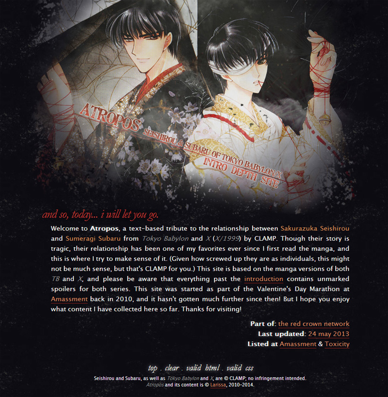 Initially, I named this site after that crossover fic, but when I revamped the site I decided to rename it — it didn't feel right using the name of someone else's work for my own site. The site is now called death wish; I was inspired by the Gackt song of the same name, which you can listen to on the fanmix. It's also, uh, more than a little fitting given the plot of X. (Plus, what's more fitting for a tragic CLAMP pairing than Gackt?)